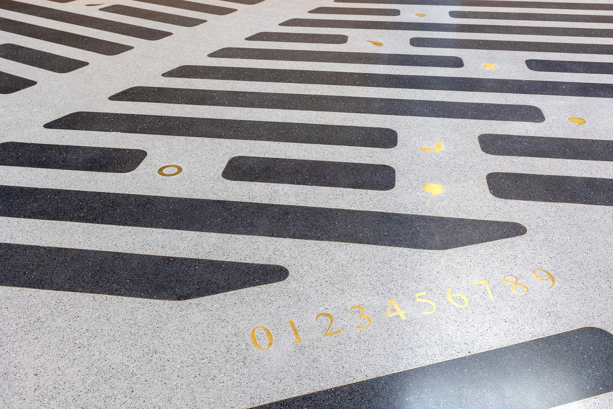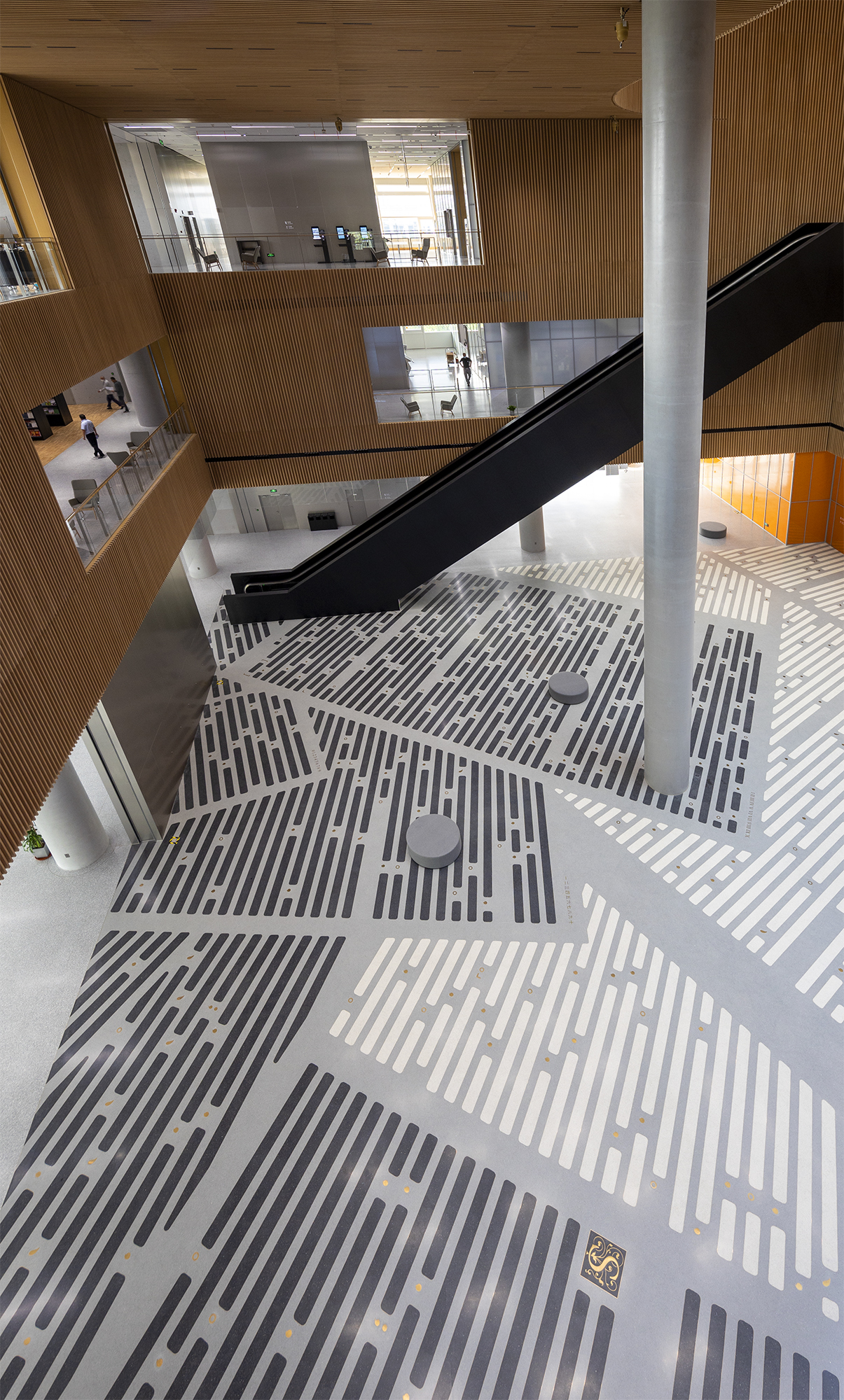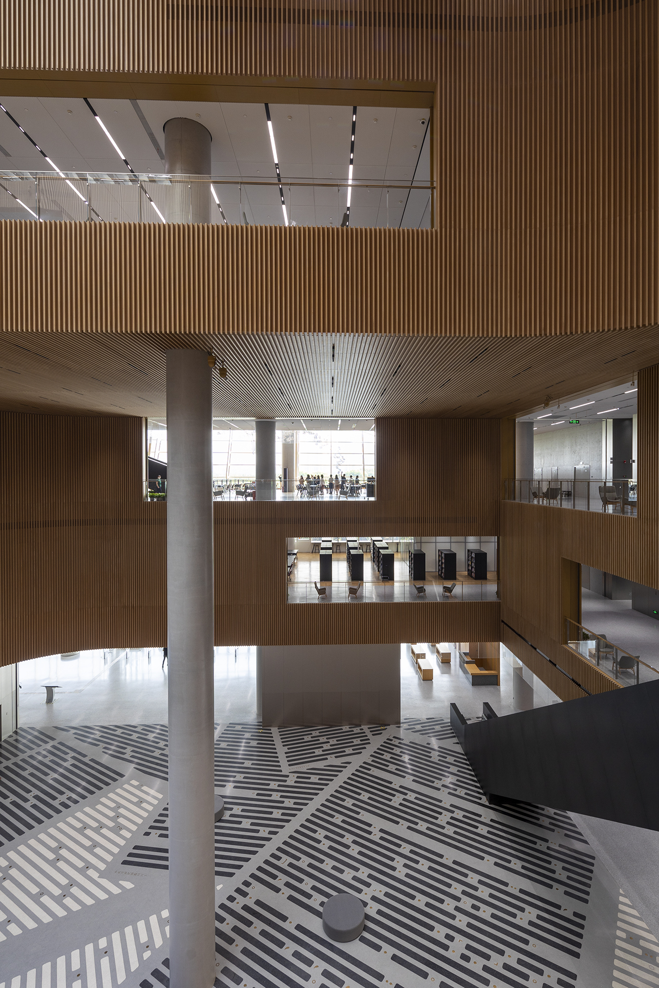 場館最大亮點(diǎn)中庭,是藝術(shù)家申凡的藝術(shù)作品《往來春秋》——以老報(bào)紙為創(chuàng)作原型,讓長短的文字抽象化為黑白線條,只留下標(biāo)點(diǎn)符號作為分隔——層疊交錯(cuò),仿佛隨意置于書桌上的報(bào)紙。